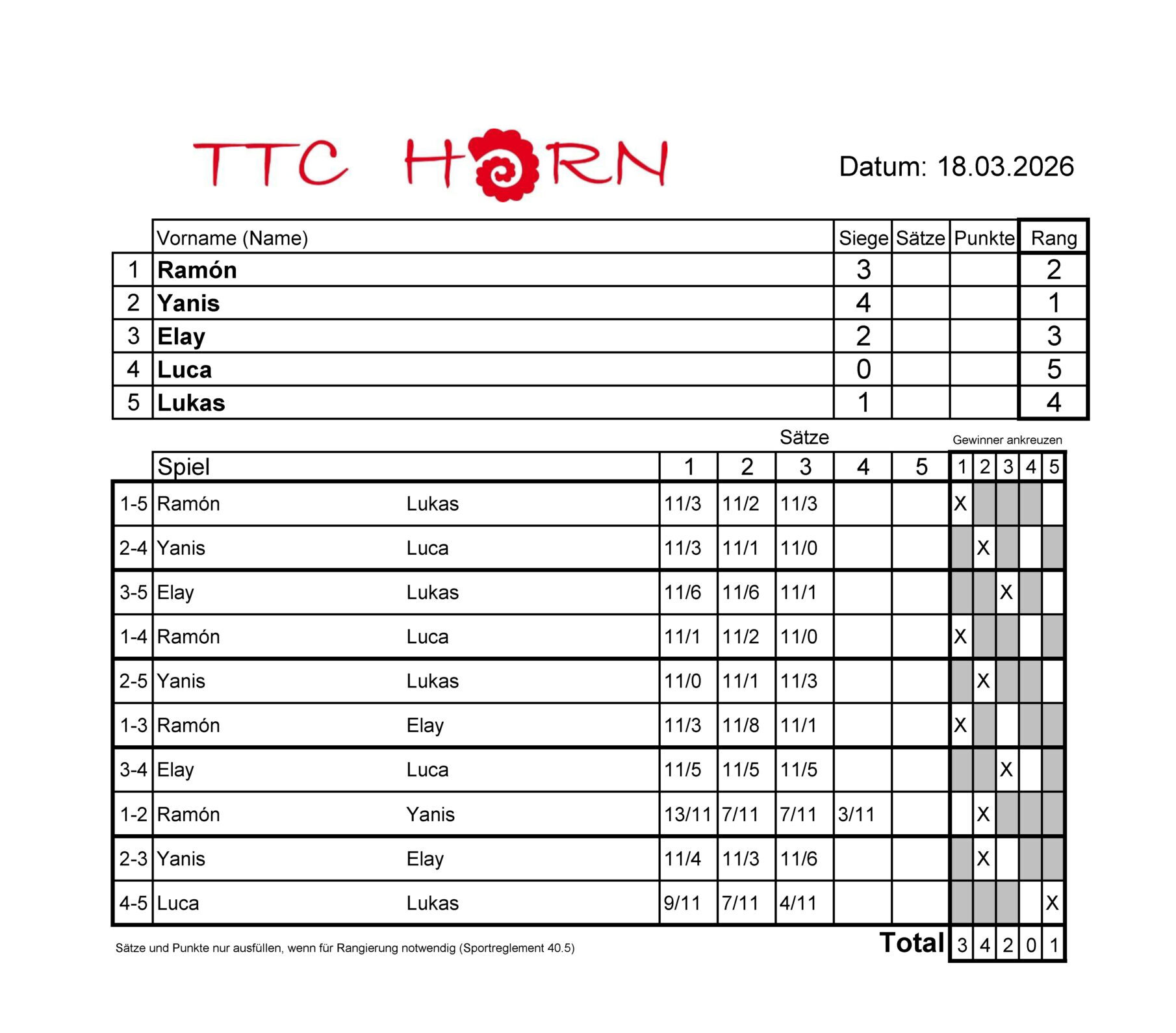 Es ist schön, dass der TTC Horn das Trainingslokal im Feuerwehrdepot hat, so konnte ohne grosse Umstände die lokale Ausscheidung gespielt werden. 5 Jugendliche haben sich eingeschrieben und das Schülerturnier mit grossem Elan gespielt. Die Resultate sind aber eine klare Sprache des Spielniveaus. Ganz besonders die Jüngsten haben gezeigt, dass beim richtigen Einsatz der Reiz des Gewinnens gross ist und sich auch dementsprechend mächtig ins Zeug gelegt.